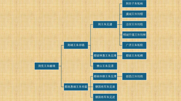 荆靖王朱祁镐共三子:荆王朱见潚、都梁王朱见溥、樊山王朱见澋,都昌惠靖王朱祁鉴亦有三子:都昌王朱见潭、镇国将军朱见滏、朱见淲。换句话说,荆藩见字辈六位男性宗室,除了樊山王朱见澋以外,都已惨遭荆王朱见潚的毒手。